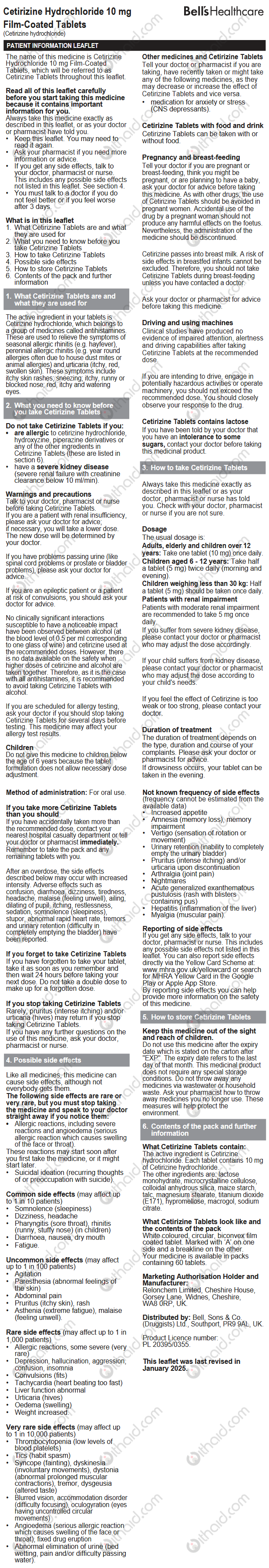 - if you are allergic to cetirizine hydrochloride, hydroxyzine, piperazine derivatives or any of the other ingredients in Cetirizine Tablets (these are listed in section 6)